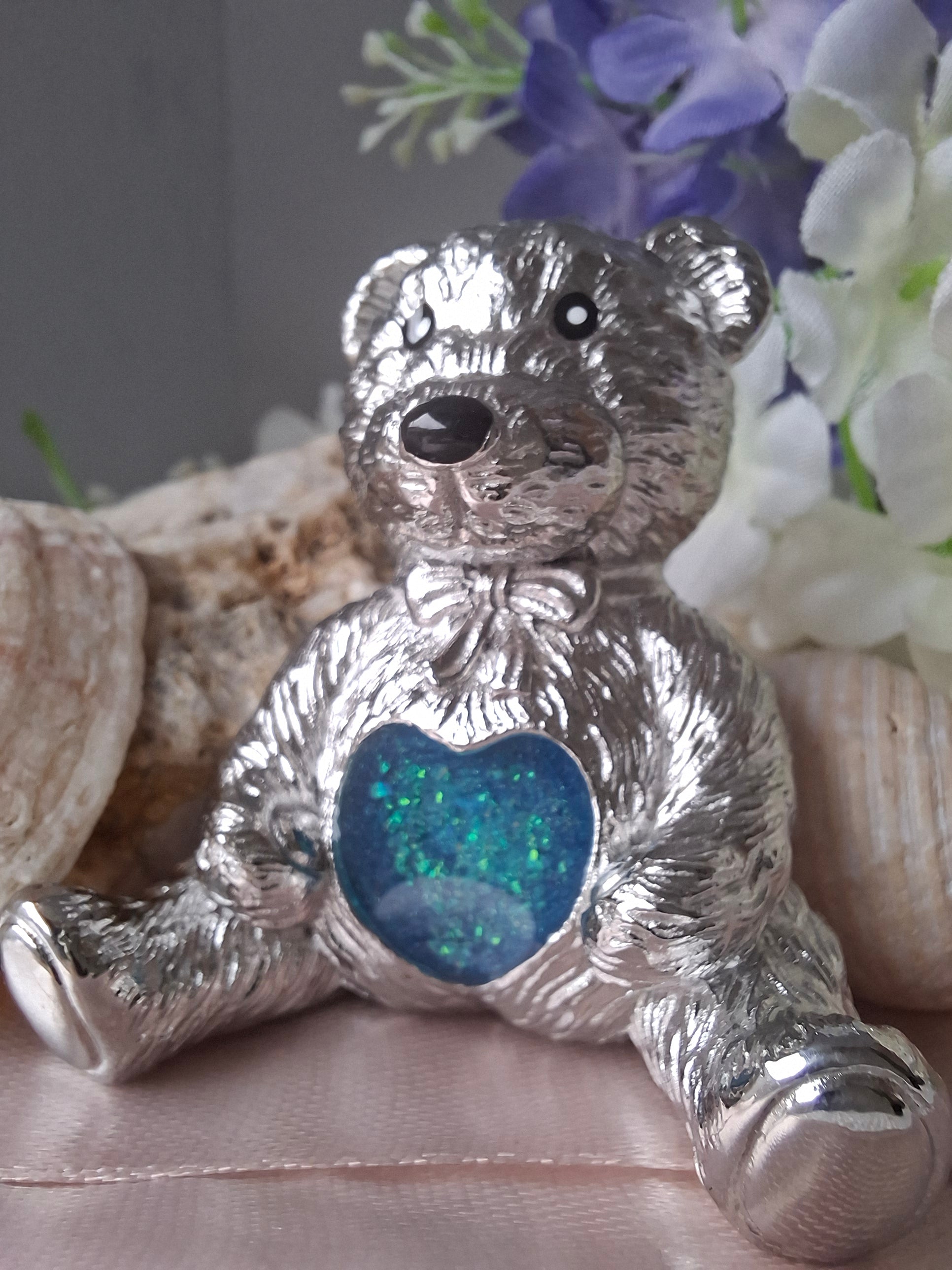 This precious teddy bear ornament is crafted from high-quality stainless steel and holds a small heart shaped resin space in its belly, gently cradling ashes in your chosen opal colours. A tender keepsake, it symbolises comfort, love, and cherished memories — a timeless reminder of the bond you’ll always hold close.